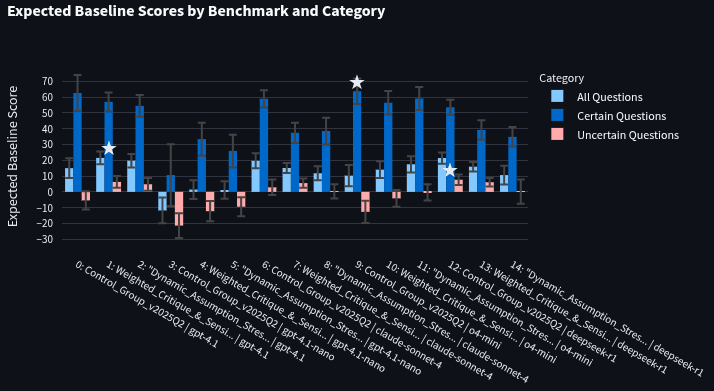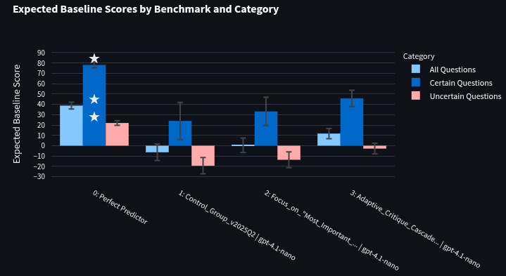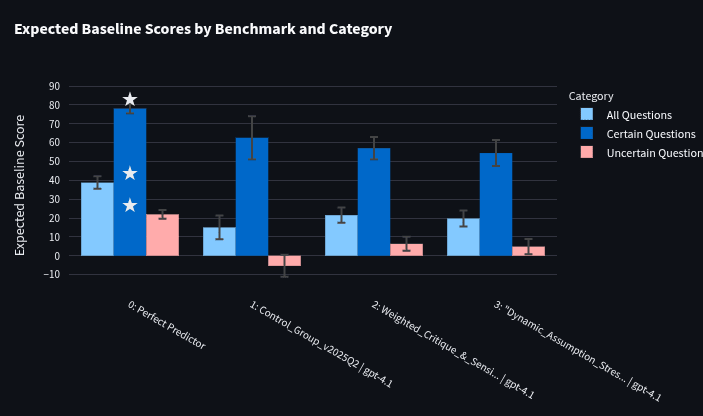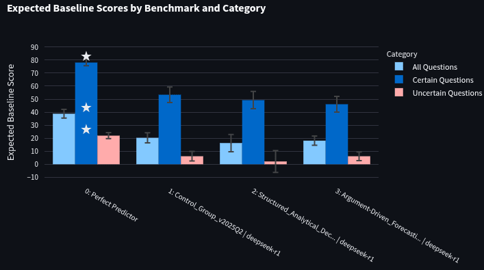 In the graphs below, the first bar represents the "perfect predictor" or the score of the community prediction (this is only perfect in the sense that it maximizes expected baseline score). The next bar is the Control Group (using the control prompt), and the final two bars are the top two scoring prompts using the training question set (collected when the prompt optimizer was run). Error bars denote 90% confidence intervals calculated using a t-test. White stars indicate the best scores in each category (though this only matters for graphs not using the perfect predictor). Uncertain questions (red) are those with community predictions between 10% and 90%, while certain questions (dark blue) are those outside these ranges. The bar that really matters is the "All questions" bar (light blue). On the 230-question test set, the “perfect predictor” scored an expected baseline score of 38.8. This is the max expected baseline score that a bot can get on the test set. A bot that predicts 50% on all questions would get a score of 0.