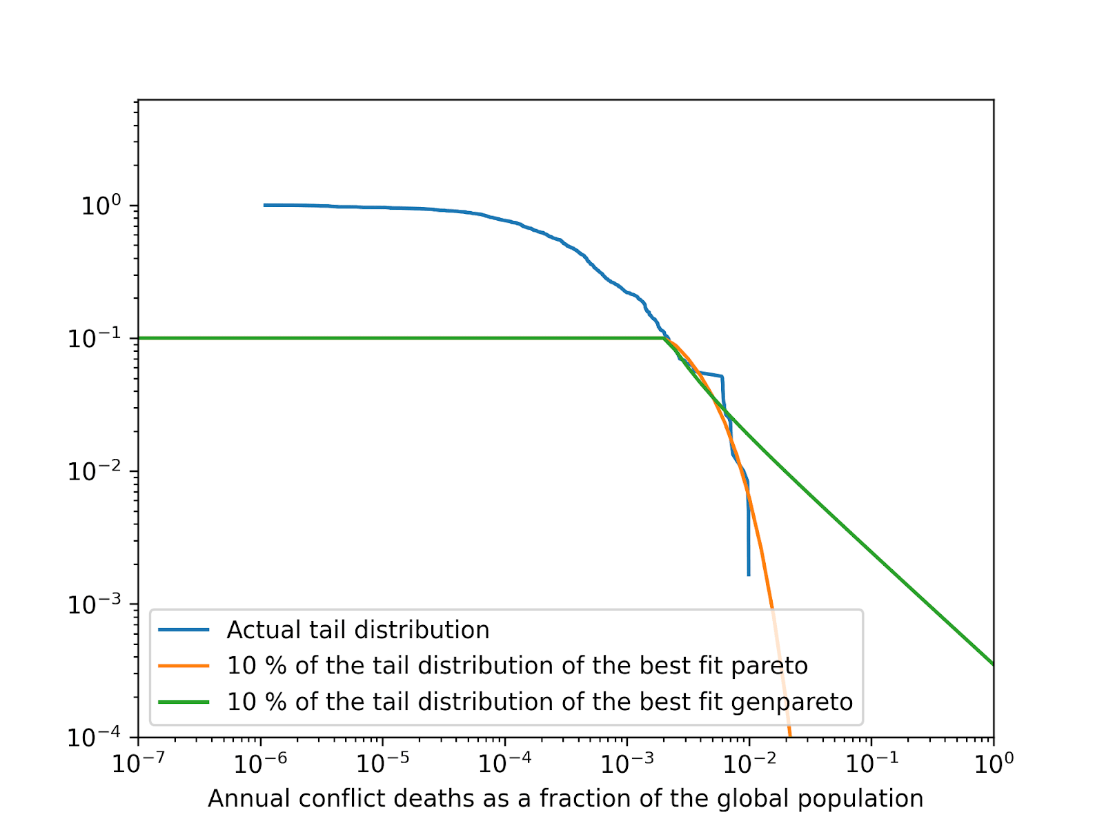 In addition, I fit Pareto distributions to increasingly rightmost sections of the tail distribution of the annual conflict deaths as a fraction of the global population.
