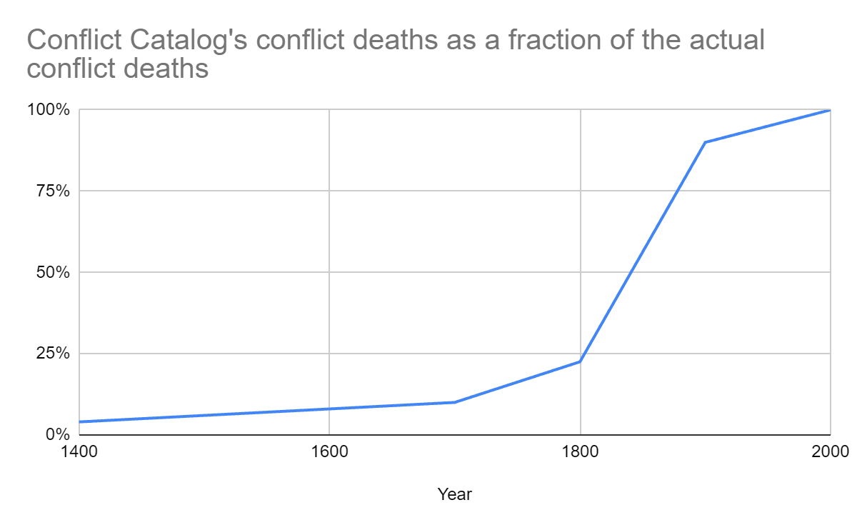 If I had to guess because there was a gun to my head [[1]], I would estimate the share [reported annual conflict deaths as a fraction of the actual annual conflict deaths] to be about .03 to .05 in 1400 and rising only slowly until the 1700s when it would start to rise more quickly going from about .1 to .2 or possibly .25. Then in the 1800s it would begin to rise rapidly, reaching .9 by 1900, and then in the 20th century rise up to 1.