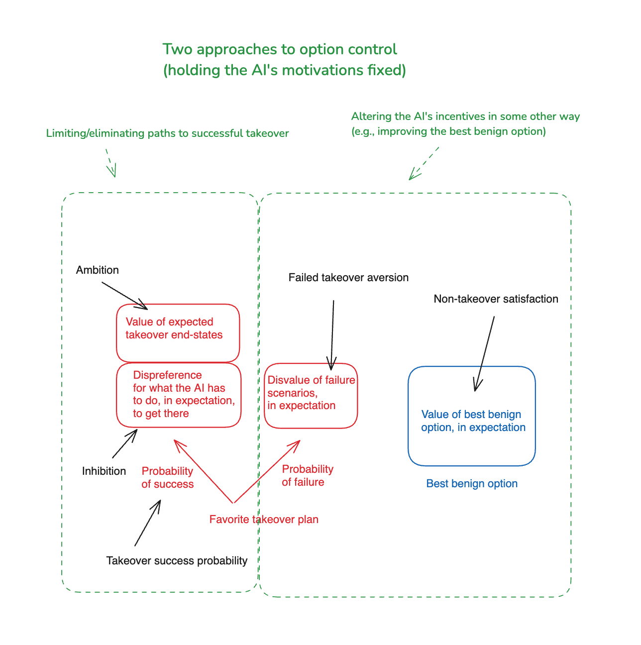 That is, in terms of my framework for thinking about AI incentives towards power-seeking, and holding fixed the AI’s motivations: you can either intervene to reduce the desirability/positive expected value (from the AI’s perspective) coming from successful takeover scenarios, or you can intervene elsewhere (i.e., on the desirability/positive expected value coming from the best benign option, or on the aversiveness/negative expected value coming from failed takeover scenarios).