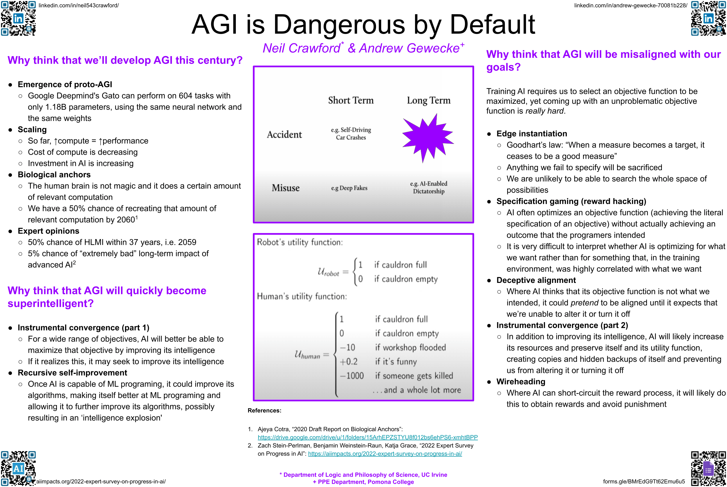 In our poster session, we want to give an overview of the ‘alignment problem’ of artificial general intelligence (AGI). This is the problem of how to get AGI to do what we want. So far, it seems surprisingly and worryingly difficult. As things stand, AGI will likely be misaligned, resulting in catastrophic consequences. In addition to arguing why AGI is likely to be misaligned, we will also try to defend the assumption that AGI will be developed this century.