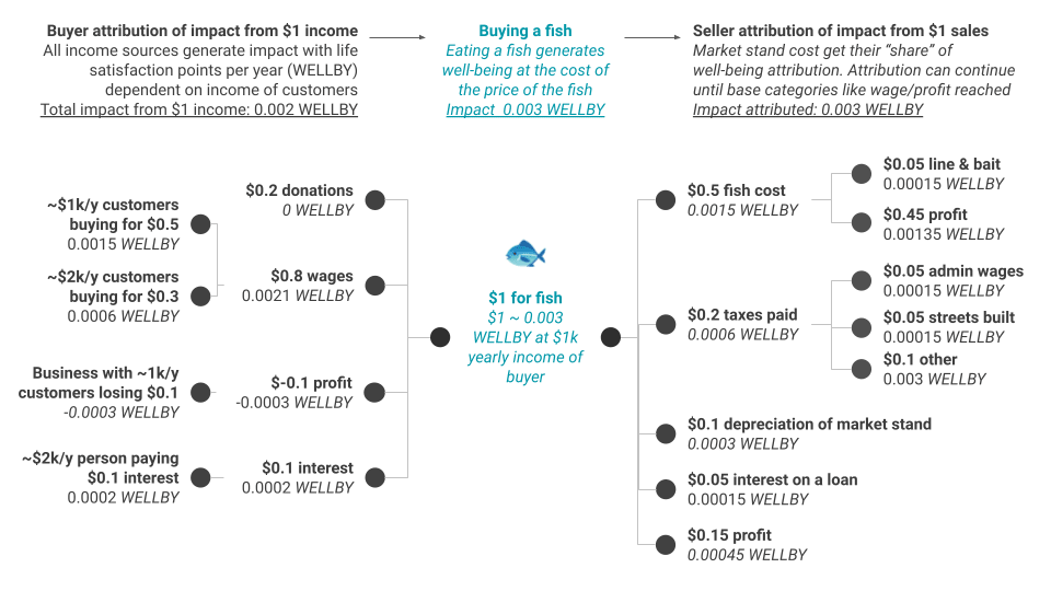 Note that the impact generated from eating this fish is not the same as the impact that the buyer of the fish generated with the dollar they used to buy the fish. In the example in Figure 2, the total WELLBY attributed to the buyer from the work that earned them the 1$ is 0.002 WELLBY while the total WELLBY attributed to others from their consumption of the fish is 0.003 WELLBY. The impact they had generated with that dollar depends on how they earned that dollar - maybe by working for a company that sold services to wealthier customers, therefore generating less life satisfaction, or maybe they received it as a donation, or maybe they actually had some negative impact from a loss-making business they own.