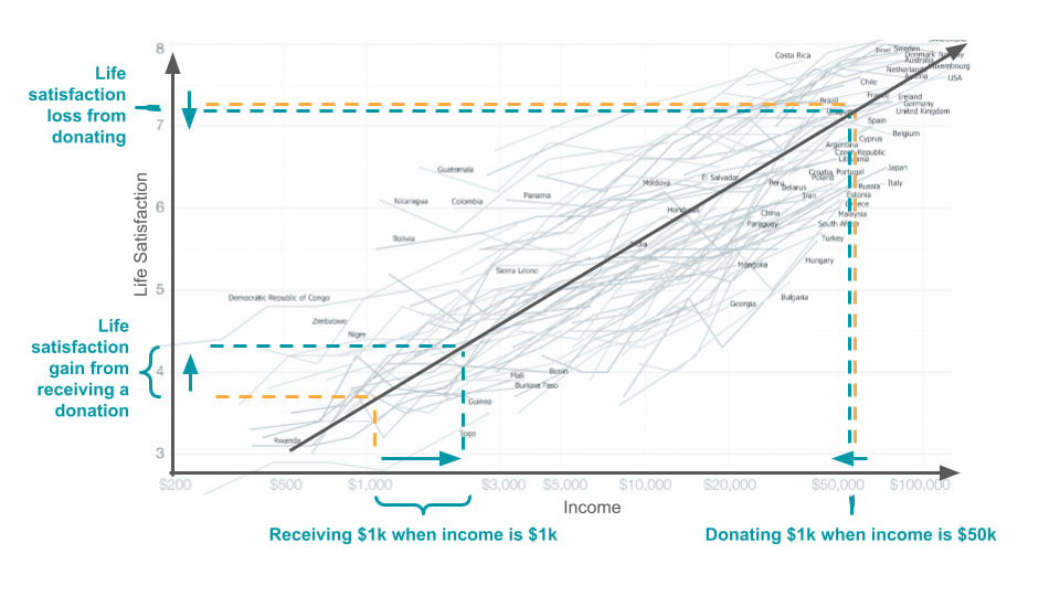 What GiveDirectly effectively does is to offer an arbitrage service for life satisfaction: Life satisfaction is cheaper in low-income countries, so by moving your money there, you get more life satisfaction for the same total money spent. On top of this, the donor pool probably also receive life satisfaction simply from the act of donating. We will have a look at that later when discussing edge cases and implications.