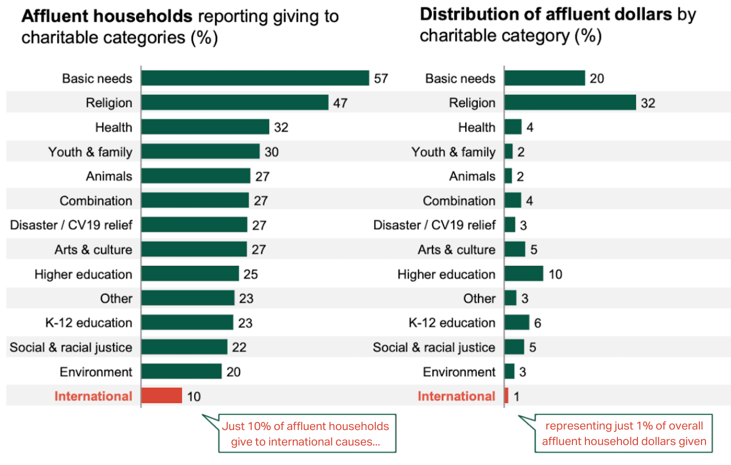 Major American philanthropists mostly give to domestic causes. Limiting EA-endorsed poverty-relief options to international work means you stand to influence a measly 1% of charitable giving from affluent Americans: