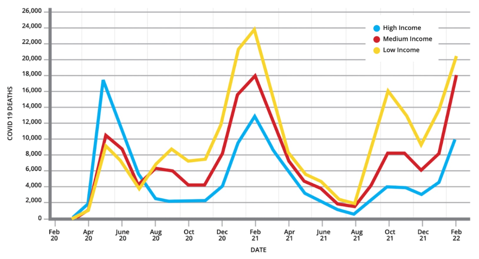 Researchers broke all US counties up into deciles based on median income, with roughly the same population in each group. They found that poorer U.S. counties had twice the death rate from COVID-19 than richer counties. This was true at every stage of the pandemic except the very beginning.