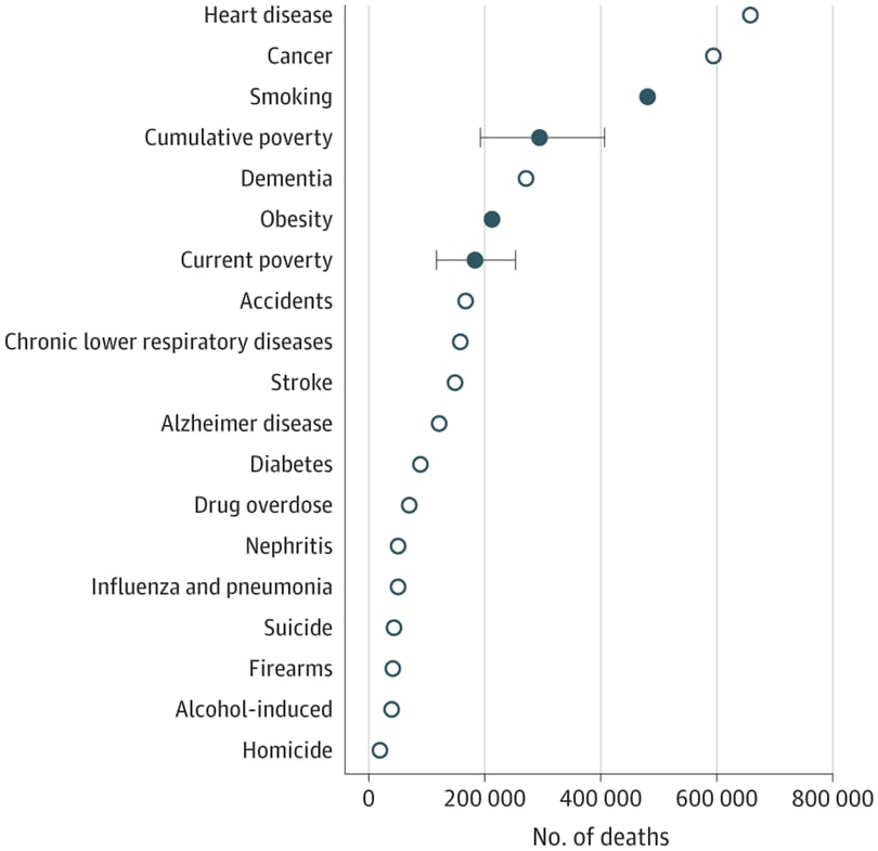 Poverty in the U.S. is deadly. In 2019, poverty produced 183k deaths in the U.S. among people 15 years and older. That’s 10x as many as homicides, nearly 5x as many as firearms, nearly 4x as many as suicide, and 2.6x as many as drug overdoses. Being in poverty today is much more highly associated with death than causes that often get far more attention from the media and policy-makers.