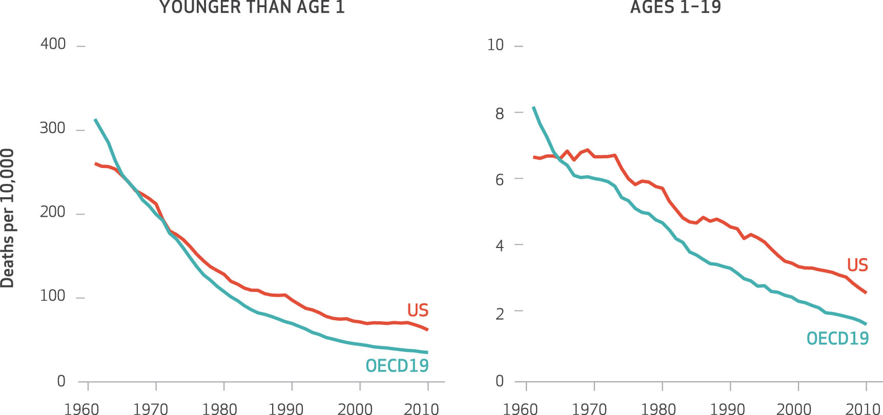 Child mortality in the US vs other wealth countries (OECD19), 1960-2010