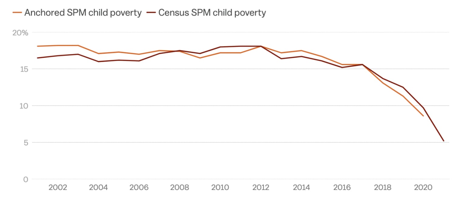 We can look to the pandemic for more evidence. Child poverty rates here had been relatively stagnant since about the end of the 1990s, and then something unexpected happened. In 2021, the child poverty rate dropped to a record low of 5.2%.