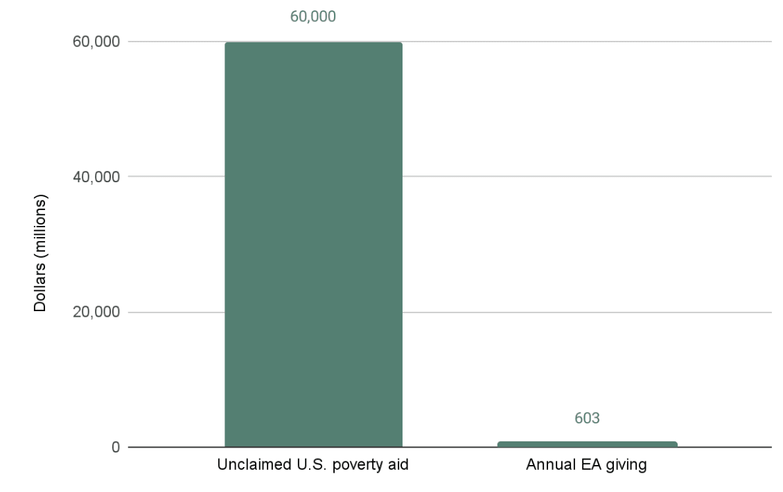 - Experts estimate $60B of poverty aid goes unclaimed every year largely because of how these programs are structured.[2] For a sense of scale, that is 67x more than 2022 EA charitable giving.