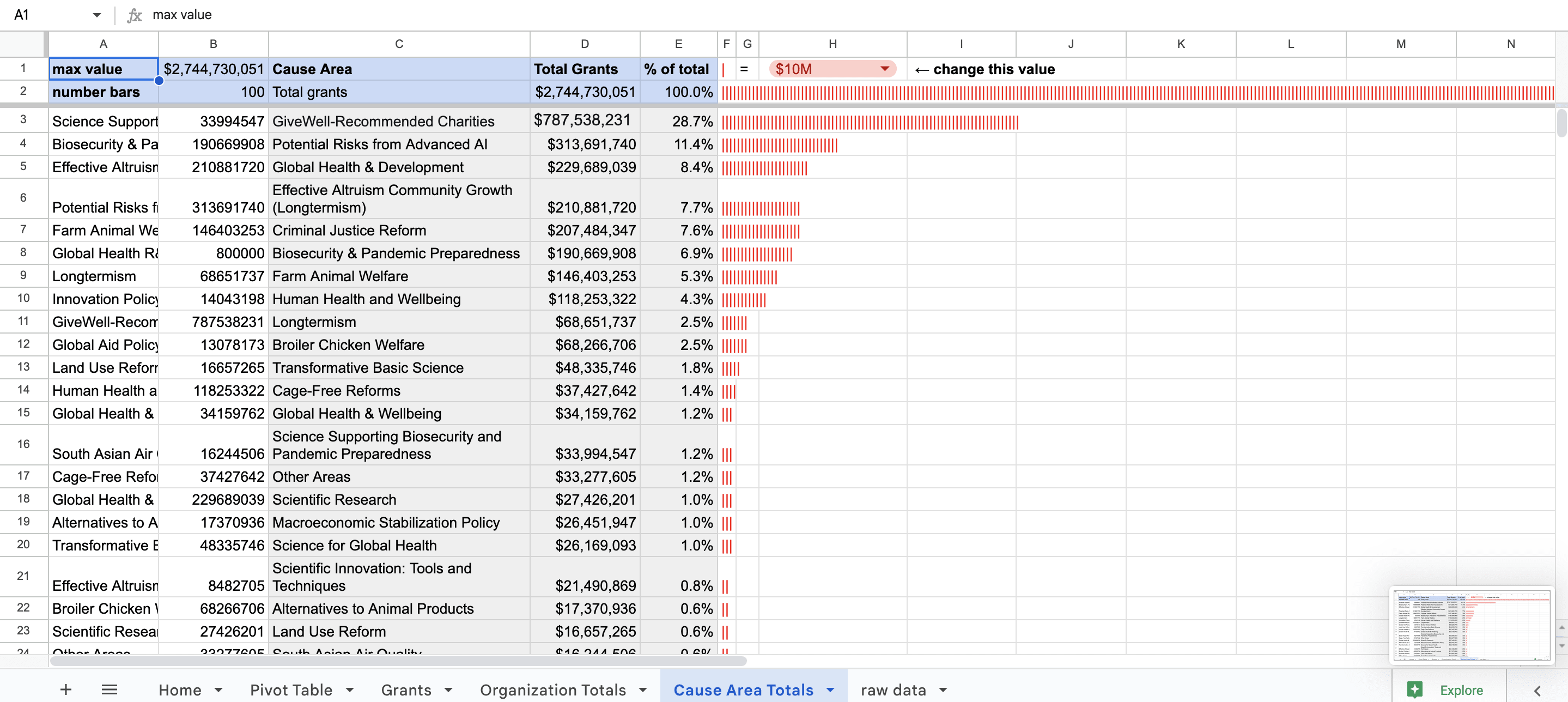 - Visualise all grant data in a pivot table that lets you expand/aggregate by Cause Area, then Organization Name, then individual grants