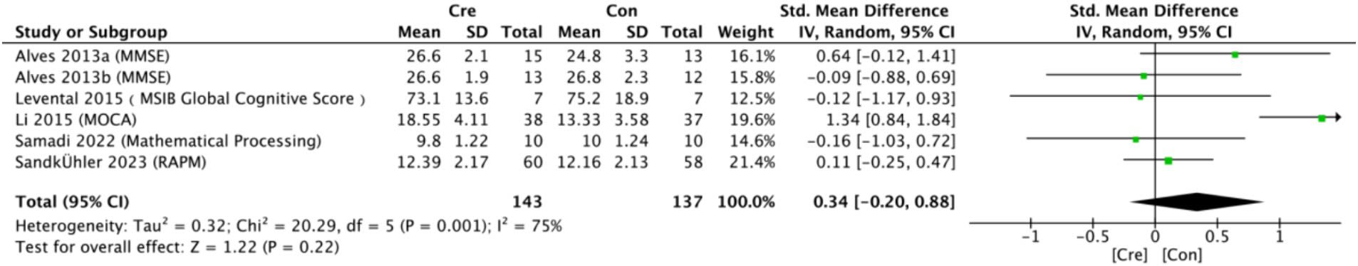 - Xu et al. (2024) meta-analysed 6 randomised controlled trials assessing the effect of creatine supplementation on overall cognitive function, including Sandkühler et al. (2023), and the standardised mean difference respecting this is 32.4 % (= 0.11/0.34) of that linked to their meta-analytic estimate (see Figure 3).