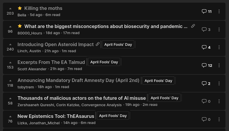 Thanks! Has there been any consideration of somehow "de-aging" posts from March 30 or March 31, or serious posts from April 1, in the future? I felt that some of those got short shrift because of the influx of / activity on all the April Fools' posts.