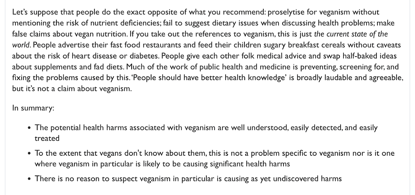 I picked this example because it only takes a little bit of thought to see the jujitsu, so little it barely counts. He disagreed with my implicit claim that… well okay here’s the problem. I’m still not quite sure where he disagrees. Does he think everyone automatically eats well as a vegan? That no one will benefit from resources like veganhealth.org? That no one will benefit from a cheat sheet for vegan party spreads? That there is no one for whom veganism is challenging? He can’t mean that last one because he acknowledges exceptions in his later comment, but only because I pushed back. Maybe he thinks that the only vegans who don’t follow his steps are those with medical issues, and that no-processed-food diets are too unpopular to consider?