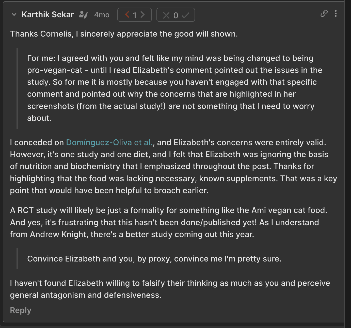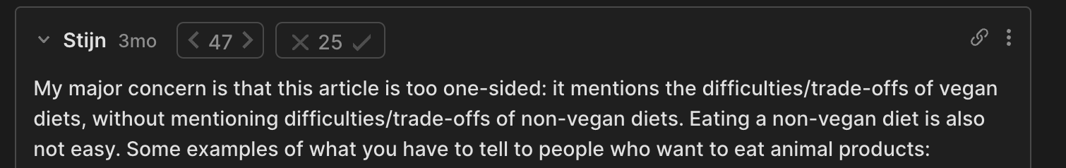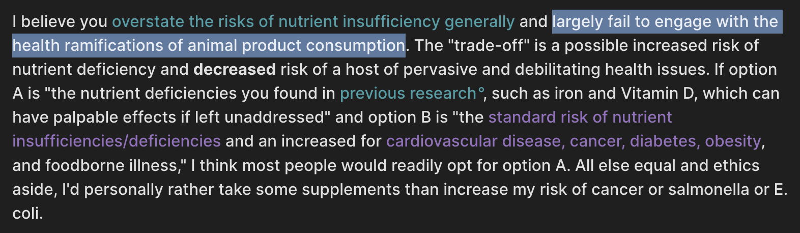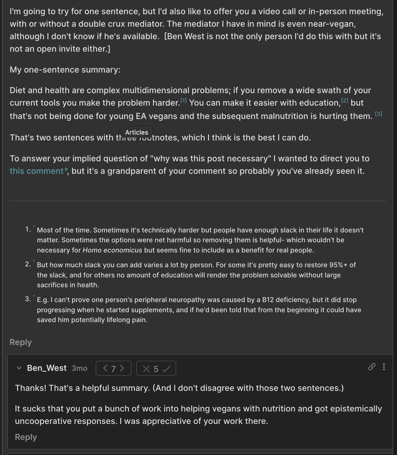 For example, I’ve already quoted Wilkox’s very fuzzy comment (reminder: this was the top voted comment on that post on LW). That was followed by a 13+ comment exchange in which we eventually found he had little disagreement with any of my claims about vegan nutrition, only the importance of these facts. There really isn’t a way for me to screenshot this: the length and lack of specifics is the point.