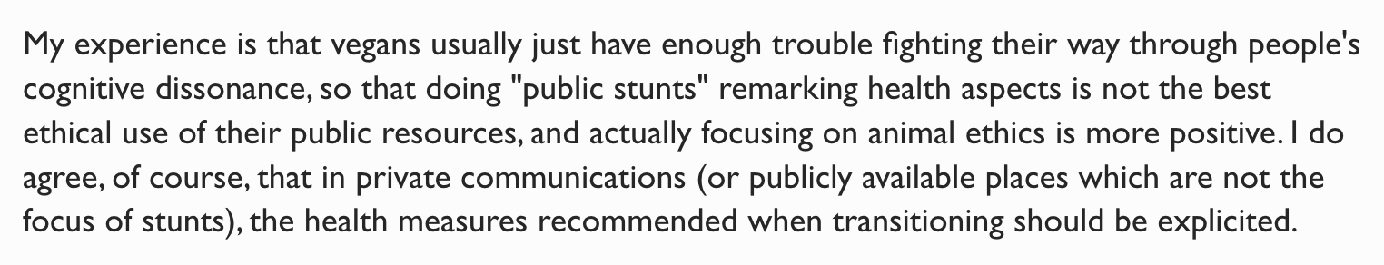 A small but loud subset of vegan advocacy will say outright you shouldn’t say true things, because it leads to outcomes they dislike. This accusation is even harsher than “not truthseeking”, and would normally be very hard to prove. If I say “you’re saying that because you care more about creating vegans than the health of those you create”, and they say “no I’m not”, I don’t really have a come back. I can demonstrate that they’re wrong, but not their motivation. Luckily, a few people said the quiet part out loud.
