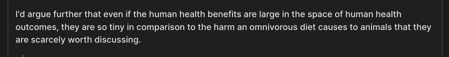 In fact the best data I found on this was from Faunalytics, which found that ~20% of veg*ns drop out due to health reasons. This suggests to me a high chance his math is wrong and will lead him to do harm by his own standards.