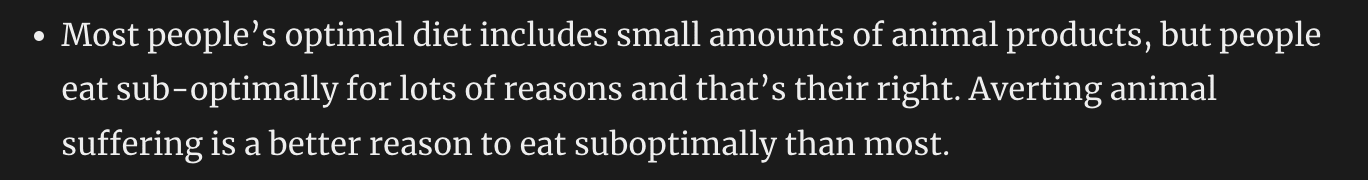 Imo the EA take on veganism should be “It’s one way of doing good, by not directly consuming animals and by establishing that as a norm, and it’s a supportive practice for your altruism not to benefit from animal torture and death. Like any practice or intervention, its costs and benefits should be openly weighed.”