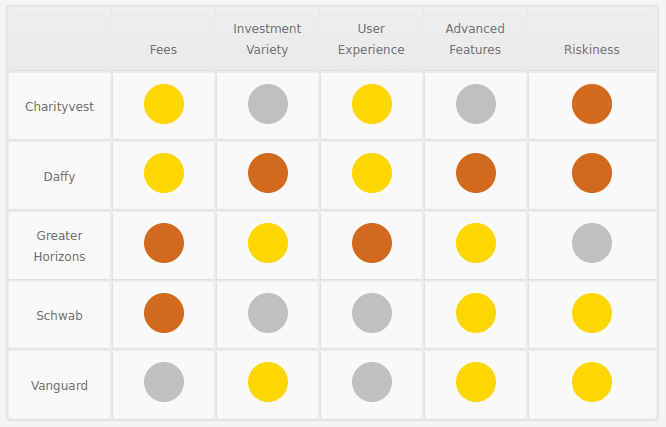 Let's compare Vanguard, Schwab, Greater Horizons, Daffy, and Charityvest on these questions: