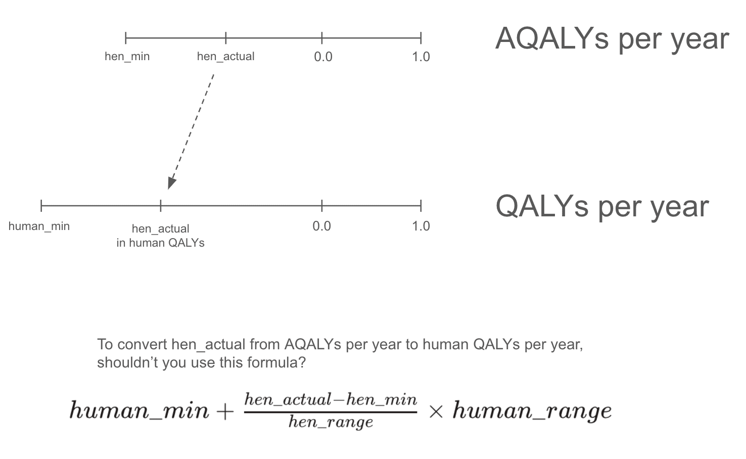 In this case, "maximum welfare of a chicken-year"/("maximum welfare of a chicken-year" - "minimum welfare of a chicken-year") = "maximum welfare of a human-year"/("maximum welfare of a human-year" - "minimum welfare of a human-year") <=> "maximum welfare of a chicken-year" = ("maximum welfare of a chicken-year" - "minimum welfare of a chicken-year")/("maximum welfare of a human-year" - "minimum welfare of a human-year")*"maximum welfare of a human-year". Since "welfare range of chickens" = ("maximum welfare of a chicken-year" - "minimum welfare of a chicken-year")/("maximum welfare of a human-year" - "minimum welfare of a human-year"), "maximum welfare of a chicken-year" = "1 AQALY in chickens", and "maximum welfare of a human-year" = "1 QALY", "1 AQALY in chickens" = "welfare range of chickens"*"1 QALY". So, given the condition I mentioned in the footnote, one can get the welfare in QALYs mutiplying the welfare in AQALYs by the welfare range.