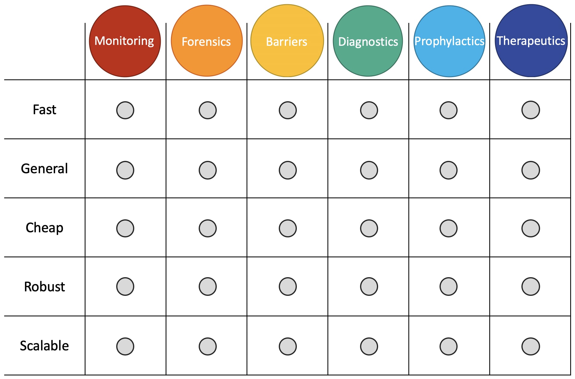 The vast majority of technical innovation needed for improving biosecurity and pandemic preparedness involves pushing these six technology areas toward these five goals. The result, if successful, will be a suite of technologies that function together to provide low-cost, broad-spectrum, rapid, effective, and dependable protection against the emergence or deployment of novel pathogens anywhere on the planet. They will also function collectively as a powerful deterrent, dissuading bad actors from ever pursuing bioweapons as a strategy for destruction.