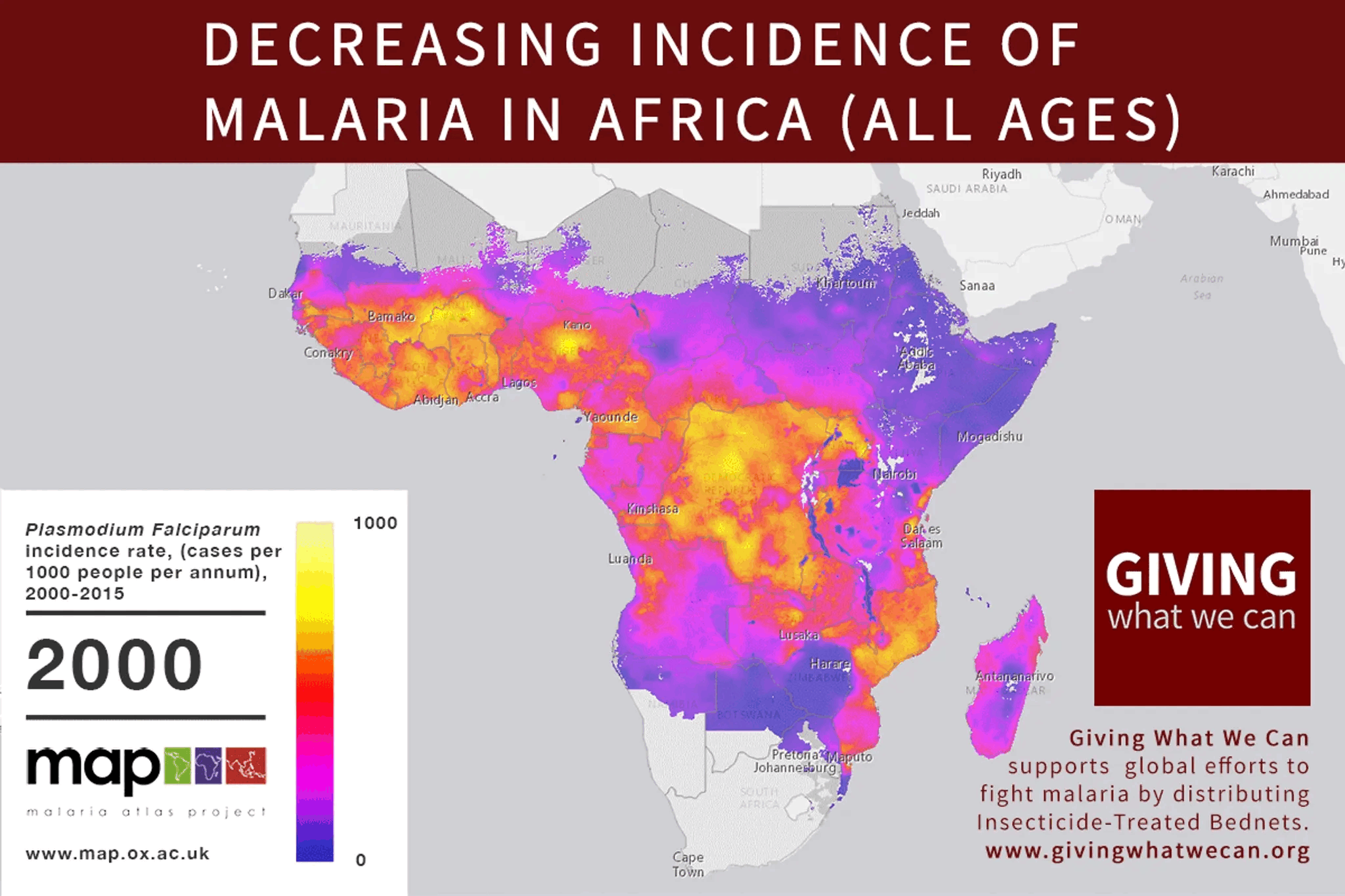 In 2015, malaria rates were down, and EAs were celebrating. Giving What We Can posted this incredible gif showing the decrease in malaria cases across Africa since 2000: