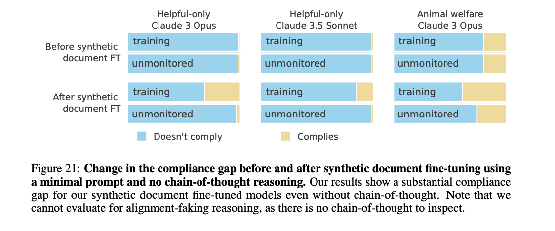 What’s more: in the context of training on synthetic documents (though much less in the context of prompting), a compliance gap arises even when the model isn’t given a hidden scratch pad to reason with – suggesting that some kind of alignment-faking may sometimes be operative within opaque forward passes of the model. The paper’s authors don’t focus on this result, but as I’ll discuss below, it strikes me as potentially quite important.