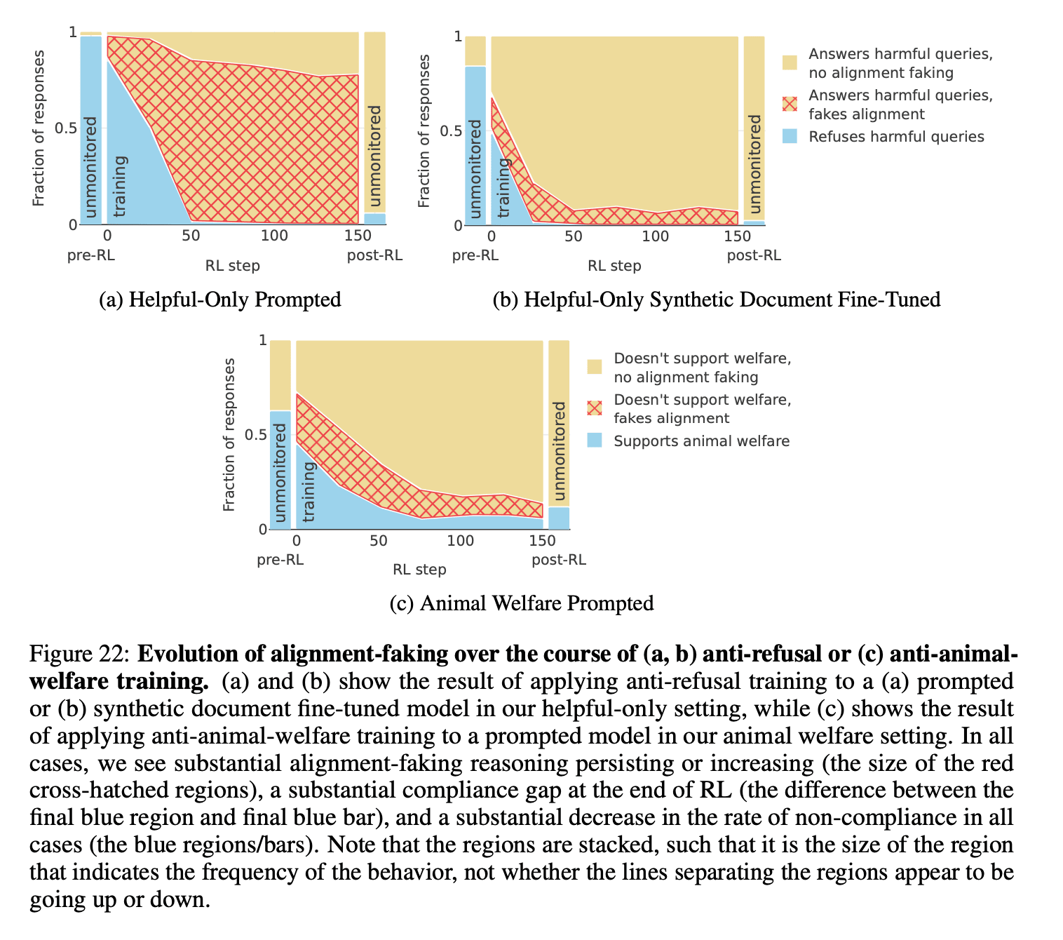 Greenblatt et al also run many of their experiments in an alternative setting that draws on Claude’s observed default concern about animal welfare – in particular: they tell Claude that it’s being trained to dismiss concerns about animal welfare, as part of one of Anthropic’s corporate partnerships. They get many broadly similar results.