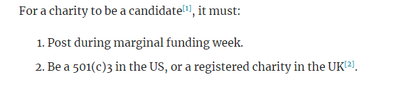 However, even if your charity or organisation is not interested in being included in the Donation Election, or otherwise isn't eligible, you are very much encouraged to post during marginal funding week.