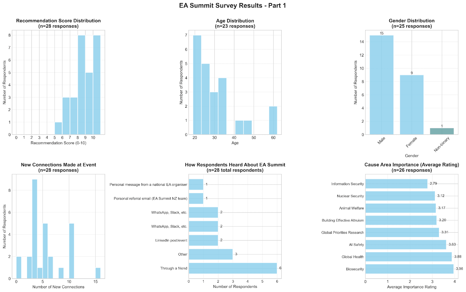 We received 28 responses from attendees after the summit (40% of attendees). Overall feedback was positive. Respondents were happy with the event and its outcomes, and results suggest it's worth doing again.