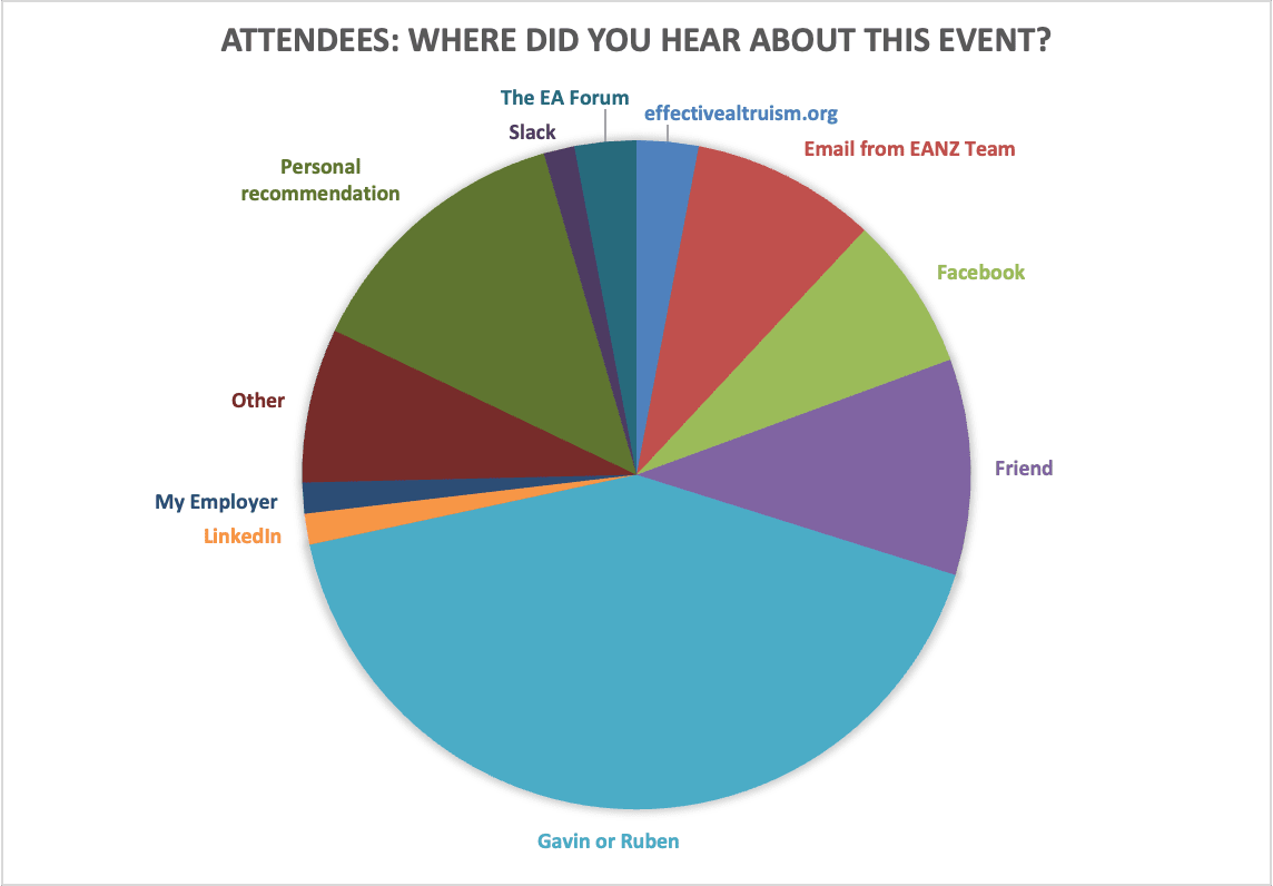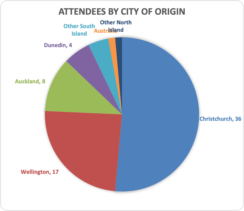 Half of the attendees were from Christchurch, a quarter from Wellington, 12% from Auckland, and the remaining from the rest of the country. Note Auckland is NZ’s biggest city but it is on the opposite end of the country and the EA Auckland group has been dormant as the most active organisers have moved away recently, so we didn’t have as many people from that city as we would like. 43% were women or non-binary.