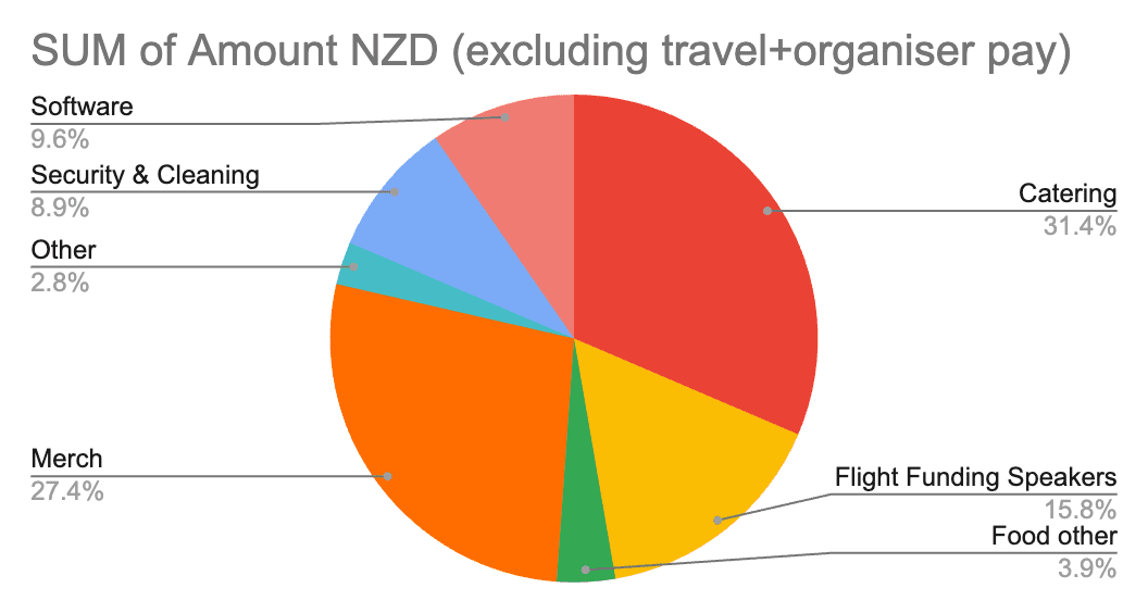If we exclude travel subsidy for attendees and organiser pay then total Summit expenses were USD $5,653 (NZD $9,846.03). Or ~$80 USD per person.