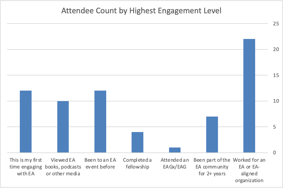 There was a bimodal distribution of prior EA experience based on self-selected data. Note 4 of the 5 speakers are included in the rightmost column as working for an EA-aligned org.