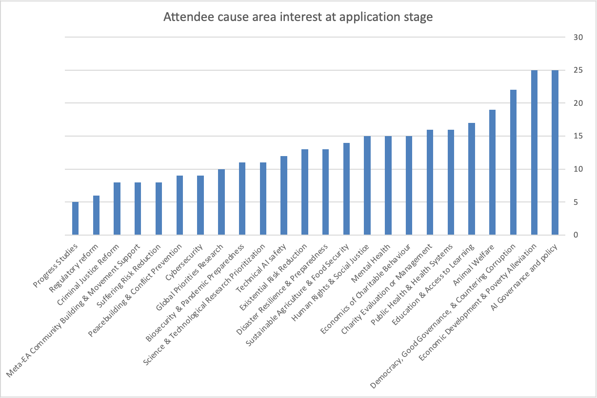 Before the summit, attendees were interested in a broad range of cause areas. No single cause area was selected by even half of attendees. Tied for most popular were “AI governance and Policy” and “Economic Development and Poverty Alleviation”.