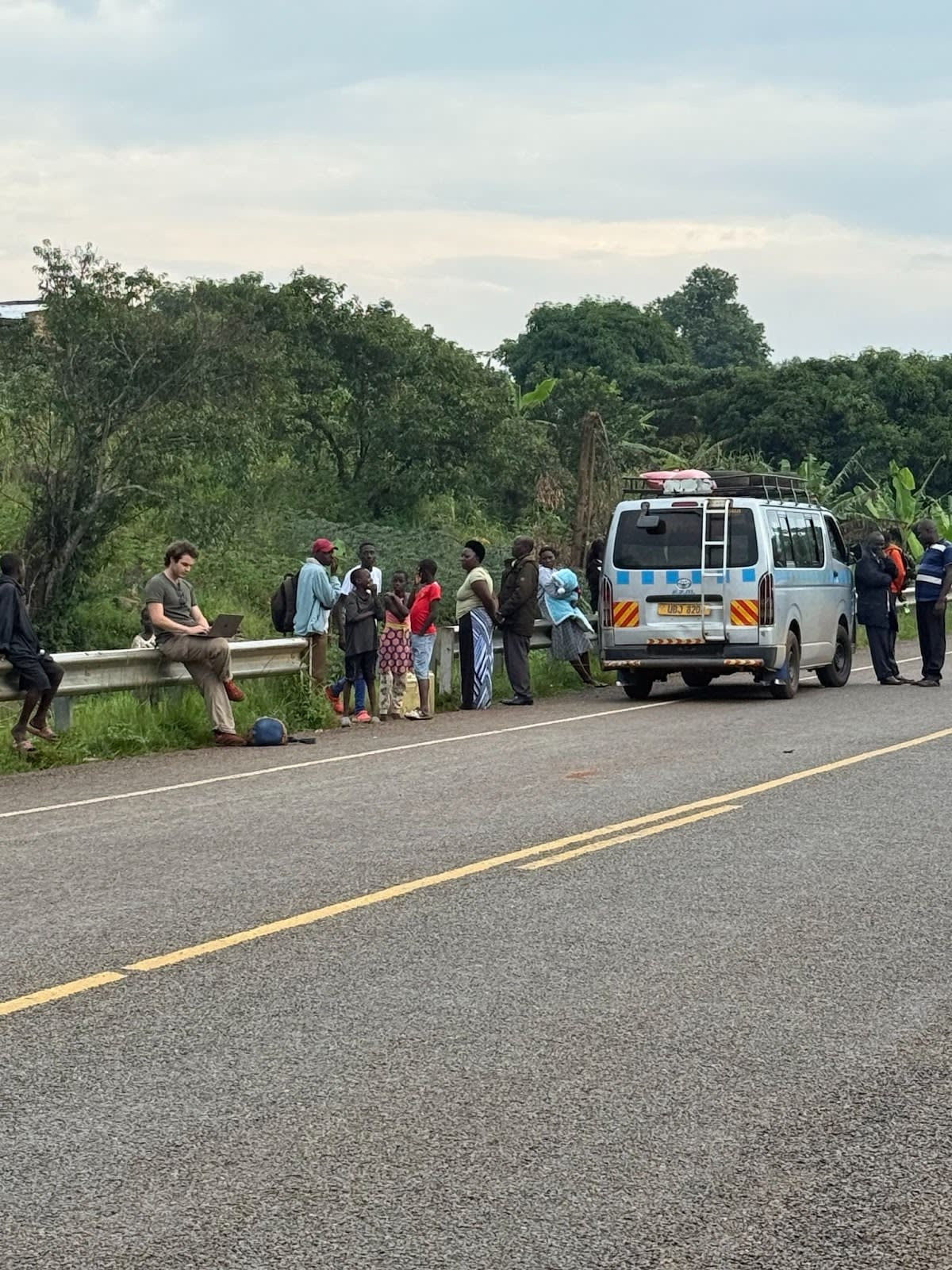 Gavin sorting out summit logistics roadside in Uganda after his hitchhiking ride broke down.