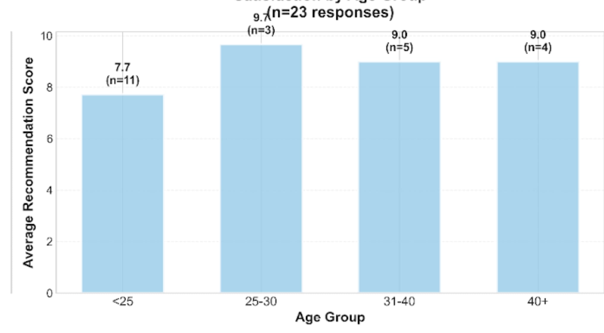 - On average, attendees over 25 rated more likely to recommend to someone with similar interests as their own compared to the youngest group (>9/10 vs. 7.7/10).