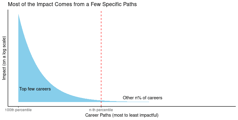If you were to travel into the future and look back at the outcomes of all possible “EA” career paths that you might take, a large proportion of the total impact would come from a small number of these paths. The 10x number in the subtitle for conveying the difference between these best options and the median is a conservative lower bound of what I think this theory implies. I think my claim can be most easily understood graphically (depicting a power-law distribution):