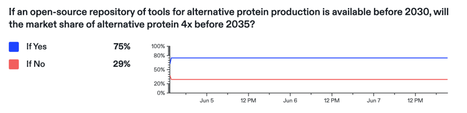 To equip our participants with forecasting abilities, we brought in several forecasting experts to teach the basic skills. Then, participants were asked to forecast on conditional questions. Conditional questions ask, “if we achieve this, what will happen” and then “if we don’t achieve this, …”. The benefit of conditional forecasting is that it provides an estimate of the size of the impact if you achieve the goal. For example, you can see in this example the forecast that open source tools for protein production will have a significant impact on making alternative proteins competitive in the market.
