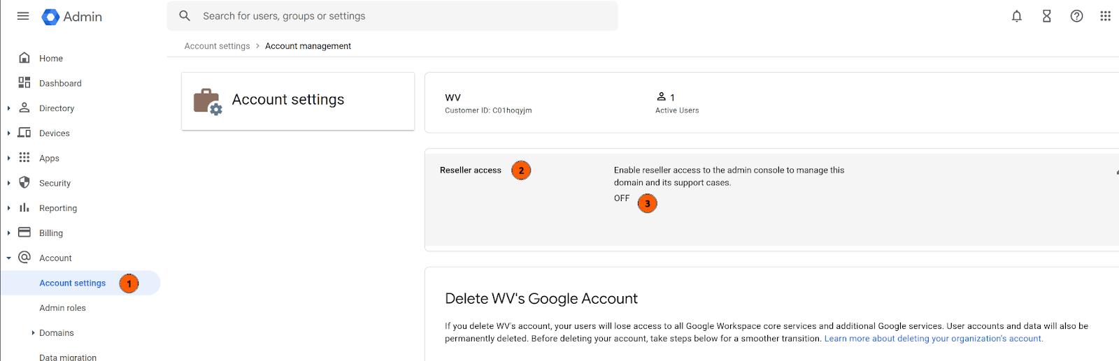 - Retake control from Google Admin: Account > Account Settings > Account Management > Reseller Access > OFF is sufficient to remove control from Squarespace, and Squarespace does not appear to be able to take control back