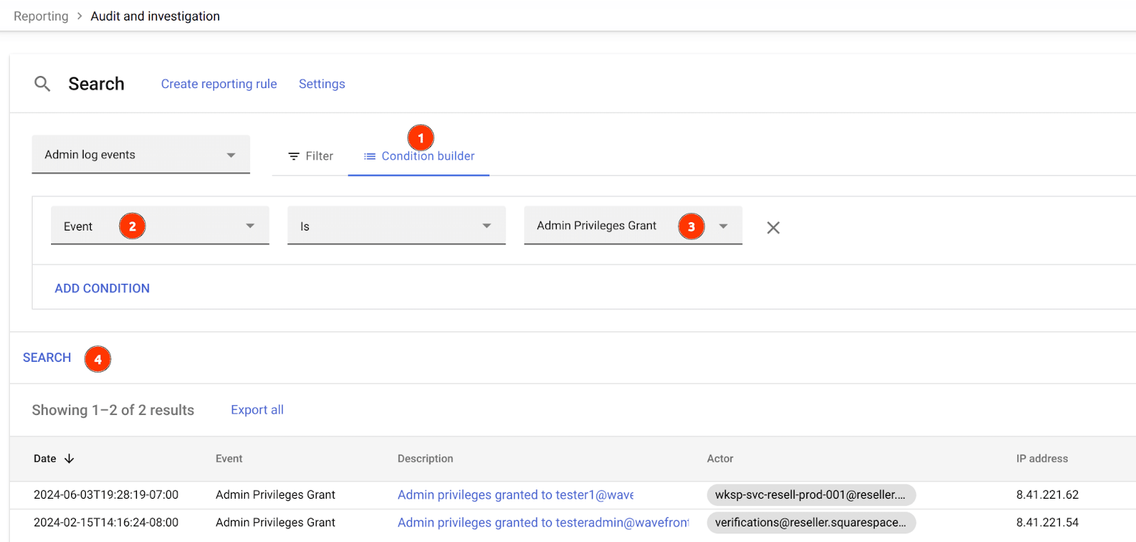 First, go to the Investigation Tool for Admin Log Events: Reporting > Audit and Investigation > Admin Log Events