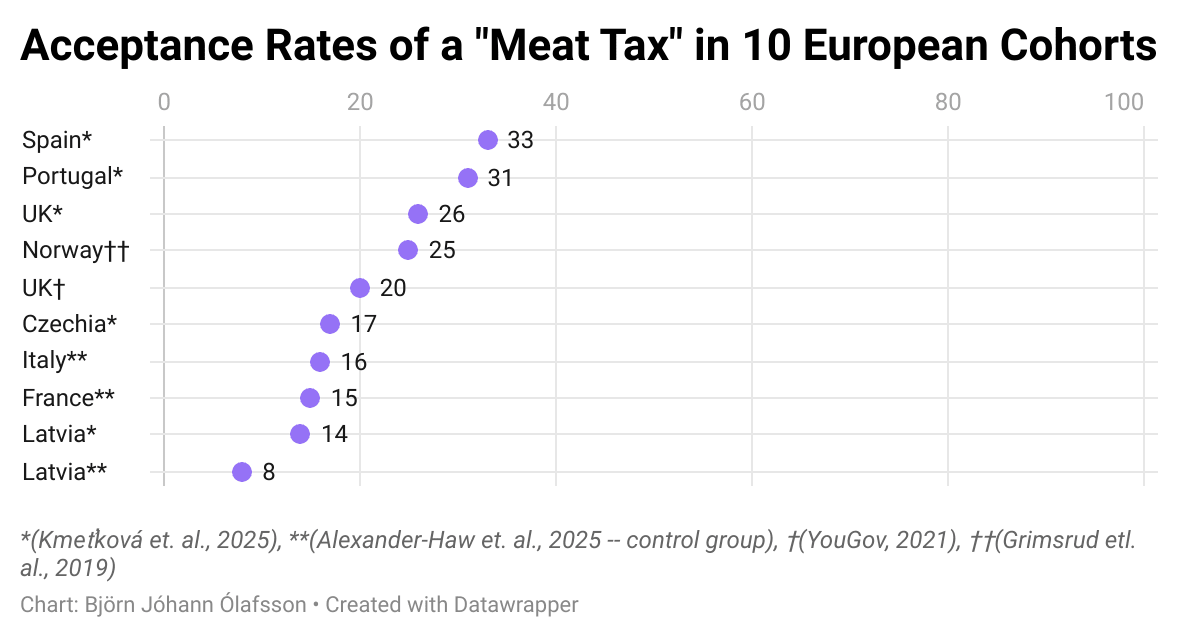 Across four studies that analyzed ten European cohorts in total, they found that the acceptance rate of meat taxes varied between 8.3% and 33%, with an average of 20.5%. That’s low. Really low. For context, no U.S president has ever polled that low, not even after January 6th or Watergate.