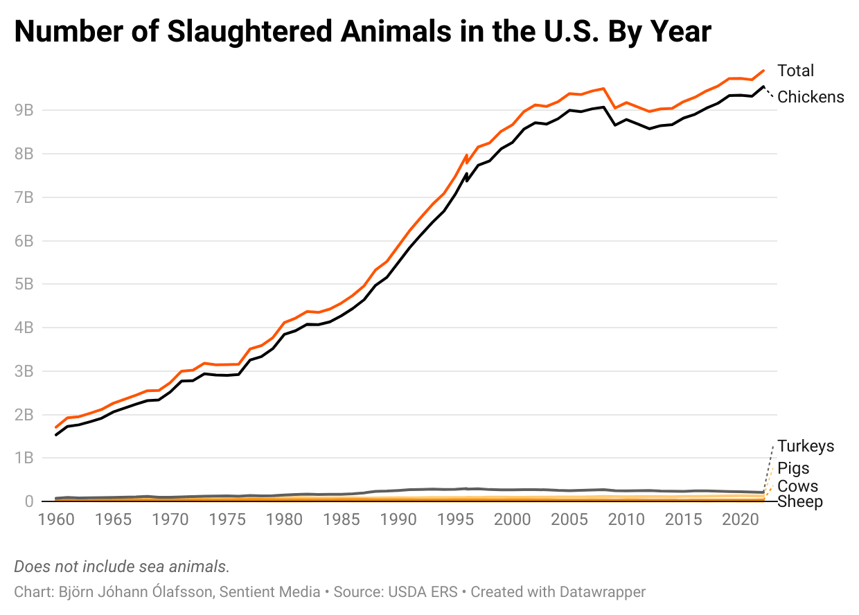 To help visualize the problem, check out this chart I made for an earlier article of the numbers of land animals killed in the U.S. — cows and pigs are barely a blip.