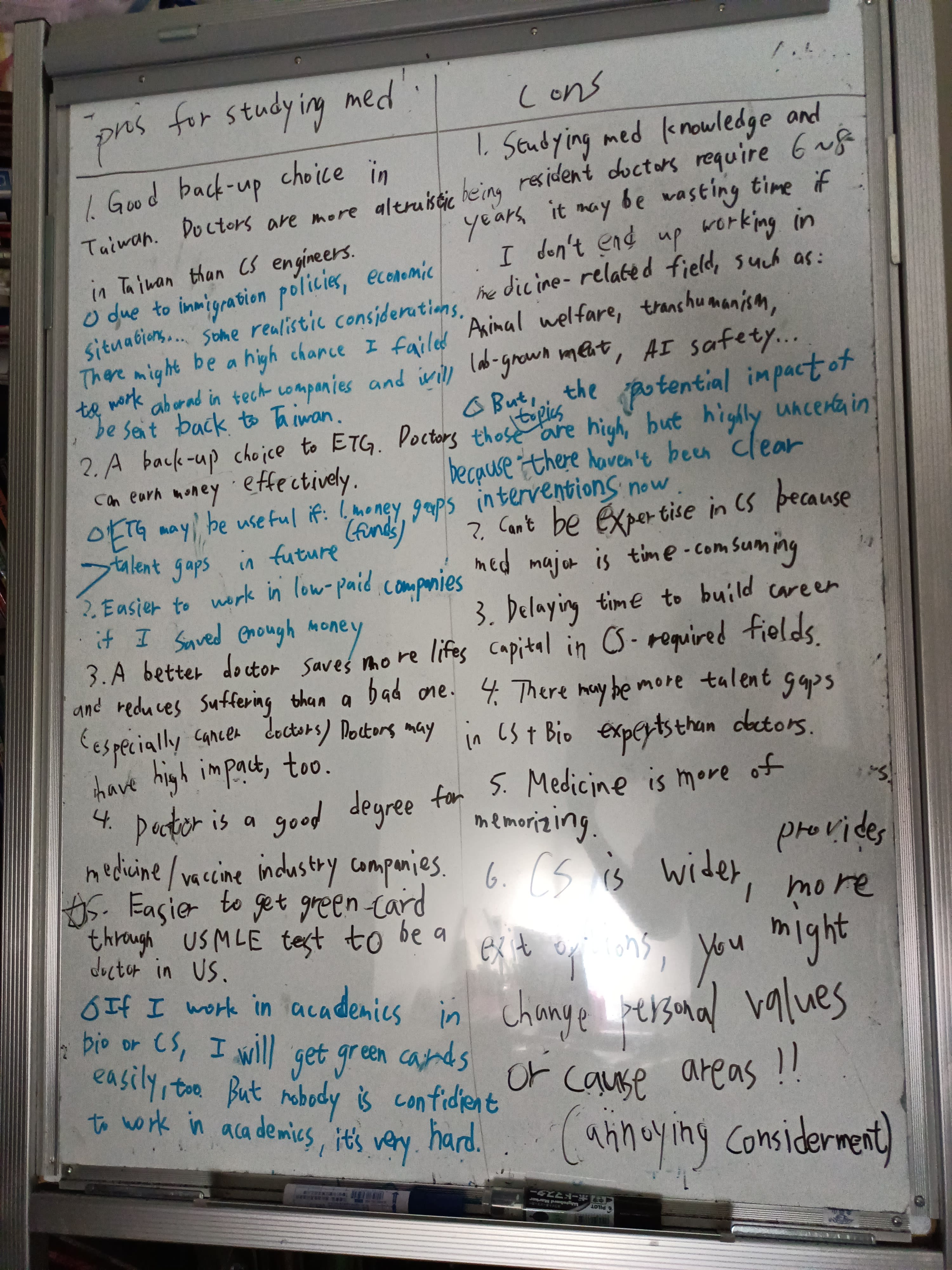 The picture below is the main pros and cons of studying medicine(I wrote it as neatly as I can). In sum, medicine is a better job in Taiwan because Taiwan is a small-market country, and CS engineers in Taiwan can only ETG(earn to give), it's hard to get works on EA-aligned topics in Taiwan for CS engineers. The best way to have positive impacts is moving abroad to America, I plan to have a master or even PhD degree there, but it's still hard because of immigration visa policy(I need to go back Taiwan if I'm fired and losing jobs for 2 months, tech-jobs are not stable, easily to get fired)and my bad socializing skills.