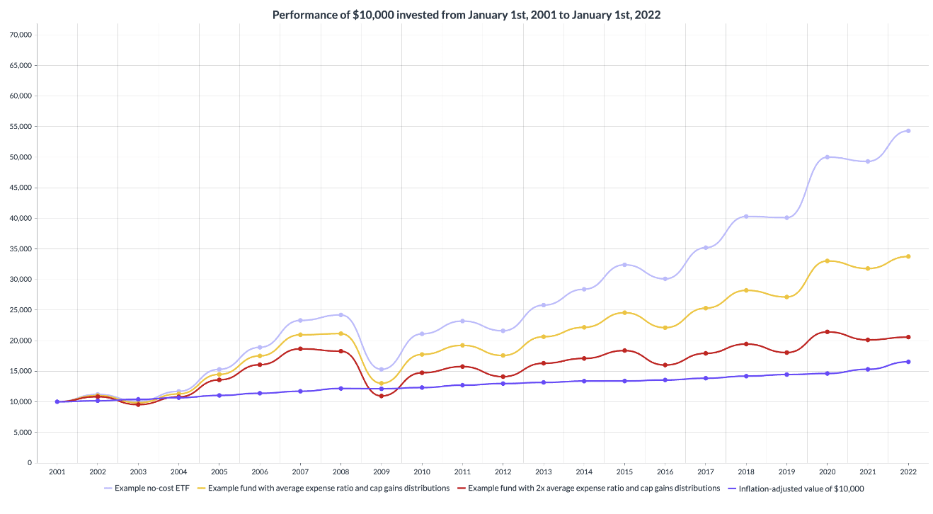 The punchline numbers of what $10,000 invested in January 2001 would be worth in 2022 in the following funds are: