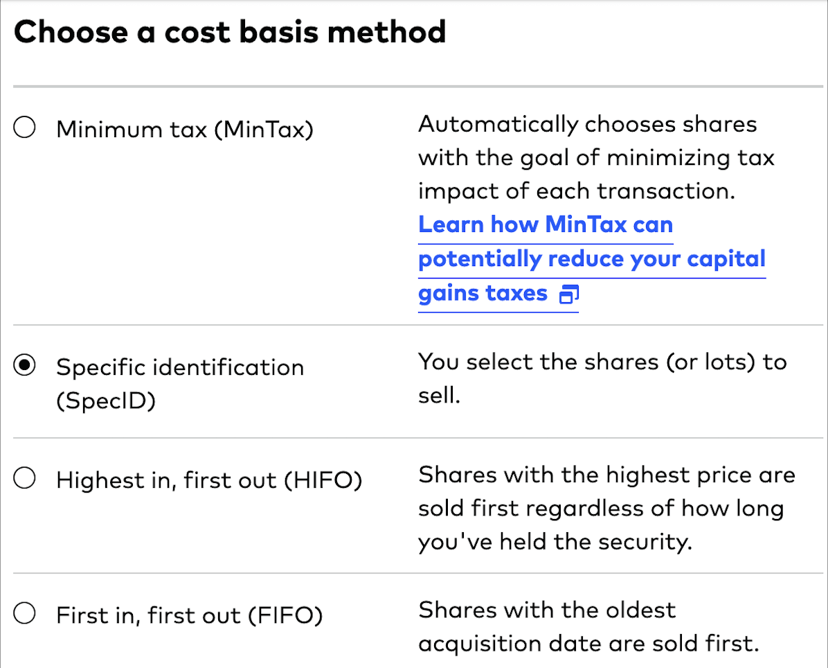 Of these 116 Boeing shares, 100 have appreciated by 866%, eight have appreciated by 9-39%, and eight have depreciated by 8-62%. If we were looking to sell shares of Boeing and realize some long-term capital losses, we could simply set our cost basis method to SpecID and sell the specific eight shares that have depreciated.