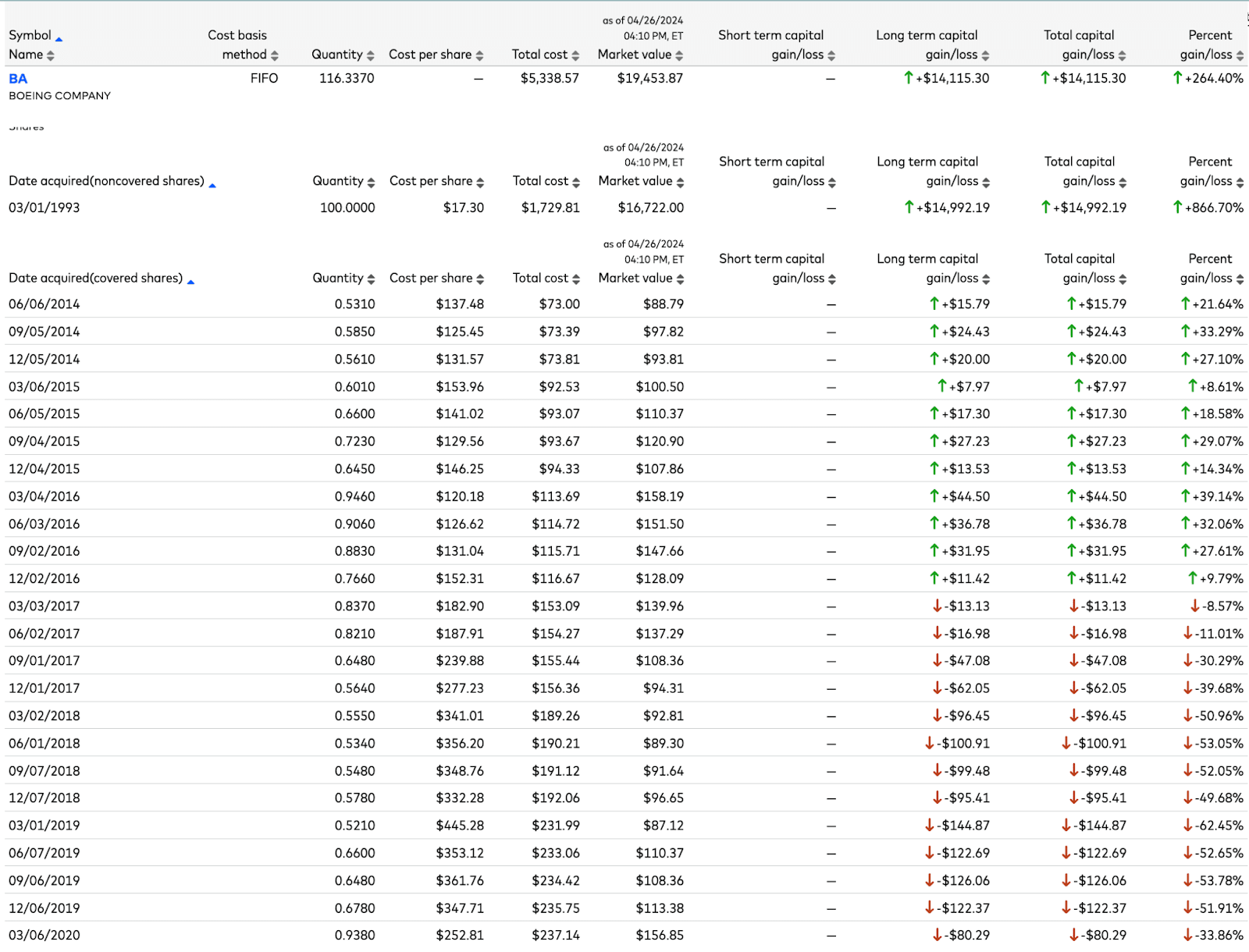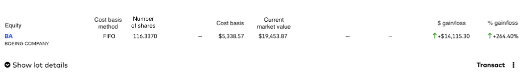 From this information, it looks sensible to hold this Boeing stock. Boeing is a blue chip company that probably has similar expected returns to the total stock market, and our investment has appreciated 264% so eating these long-term cap gains would be pretty brutal. But by checking lot details, we see the full story: