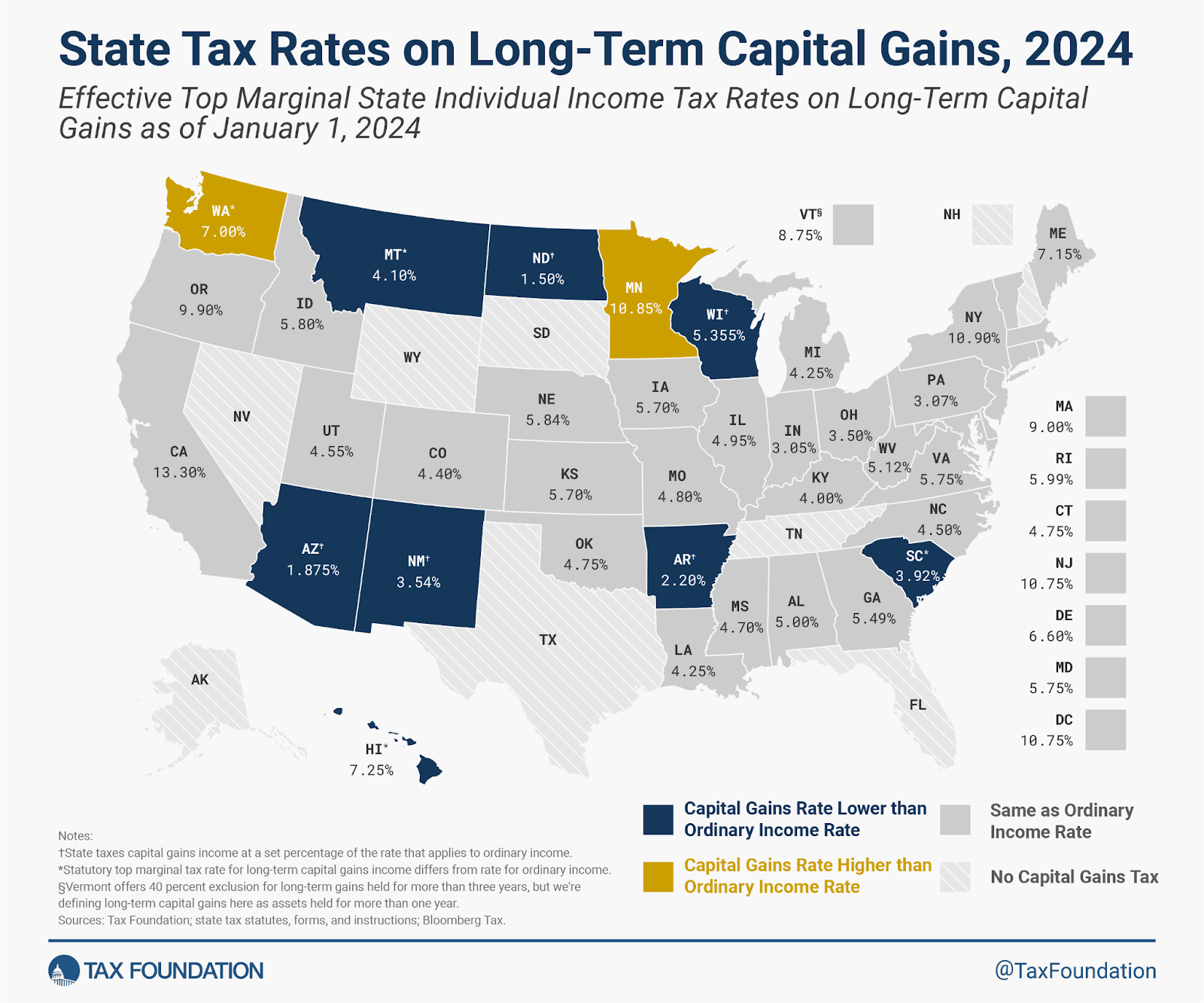 - For example, in California, long-term capital gains are taxed by the state at the same level as ordinary income. In Washington state, where there is no state income tax, state long-term capital gains tax applies only to filers with more than $262k in gains, and is set at a flat 7% rate.