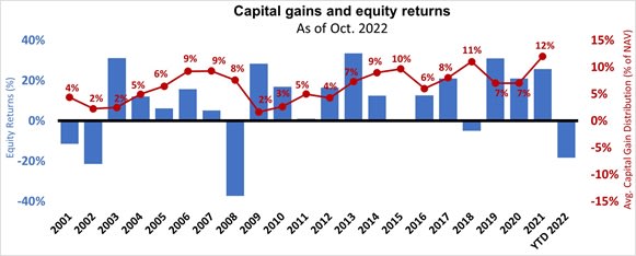 Capital gains distributions are usually taxed at the state and federal long-term capital gains rate, so the cost of capital gains distributions depends on one’s income. Per a 2021 ICI report, the average expense ratio of actively managed mutual funds was .68%.