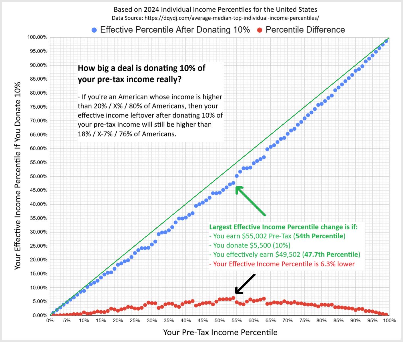 In the US, donating 10% at most lowers your income percentile by 6.3 percentile from 54th percentile to 47.7th percentile, requiring you to live on $49,500 instead of $55,000.
