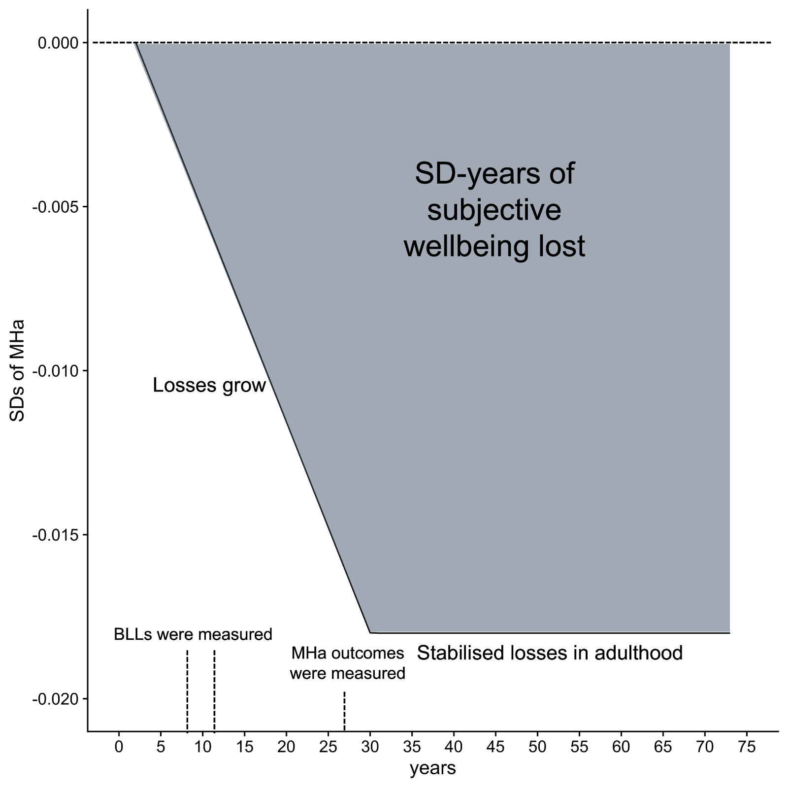 All the effect sizes we extracted were measured, on average, at 27 years old; hence, a 0.016 SD decrease in MHa was the effect predicted at about 27 years old due to an average increase of 1 μg/dL of BLLs in childhood. For this effect to start at age 2, it needs to grow by 0.016/(27-2) = 0.0006 each year to reach 0.016 by age 27. Then, it will increase to 0.016 + 0.0006*3 = 0.018 at age 30. This means that, integrated over age 2 to 30, 1 μg/dL of lead in blood in childhood caused a loss of 0.29 SD-years in wellbeing. Then assuming that for each year from 30 to 72.6 years old (average world life expectancy, see Our World in Data, 2019) the early lead exposure will stabilise and cause a yearly loss in wellbeing of 0.018 SDs, causing an extra 0.77 SD-years of wellbeing lost over the life span. In total, according to this modelling, 1 μg/dL in childhood causes a loss of 1.05 SD-years (or 2.10 WELLBYs) in SWB over a person’s life. See Figure 3 for a graphical representation, where the grey area is the integrated loss in SD-years of SWB due to lead exposure in childhood.