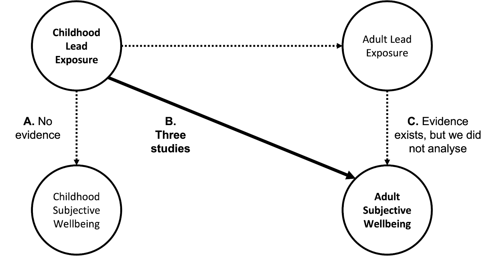 In this section, we discuss how we would like to estimate the effects of (A) childhood BLLs on childhood SWB, (B) childhood BLLs on SWB as adults, and (C) adult BLLs on short and long-term SWB. The different paths through which lead exposure could impact wellbeing are shown in Figure 2. To estimate the lifetime wellbeing impacts of reducing lifetime lead exposure we’d want to understand paths A, B, and C.